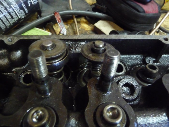 Głowica ma założony tylko wałek rozrządu i komplet mechanizmu zaworowego ale tylko dla pierwszego tłoka. Do tego zamiast właściwych sprężyn zaworowych zakładam jakieś wątłe, żeby się za bardzo przy tym nie namęczyć, a akurat to nie jest teraz ważne.