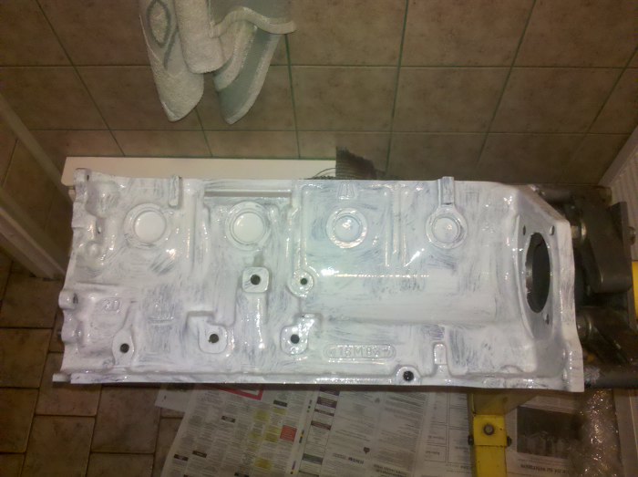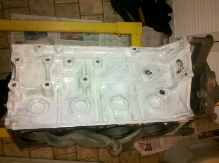 Po przetestowaniu wszystkiego (wkładałem też zawory ssące od 5.7 V8 bo akurat miałem pod ręką - są OGROMNE w porównaniu do tych obecnych i wciąż się mieszczą) znowu całość rozłożyłem i zabrałem się za czyszczenie bloku. Stwierdziłem, że pomaluję go przed obróbką, bo jakoś logistycznie mi inaczej nie pasuje - wolę nakurzyć blok przed myciem w szlifierni, żeby potem samemu nie musieć tego czyścić. Zacząłem od płaszczyzny miski olejowej.