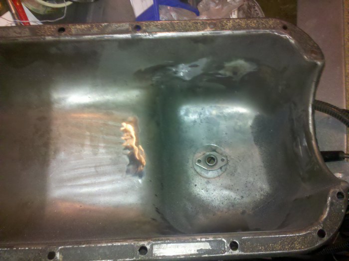 Z dużą niechęcią wziąłem się też za usunięcie blachy z miski olejowej. Coś podobnego, ale mam nadzieję nieco bardziej estetycznego będzie wspawane z powrotem.