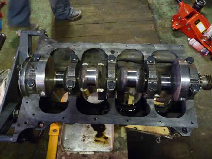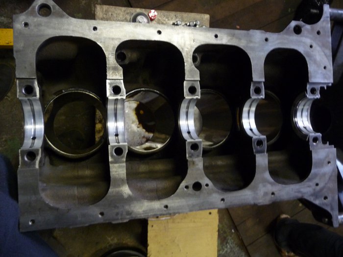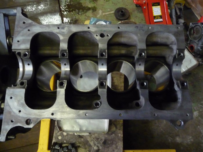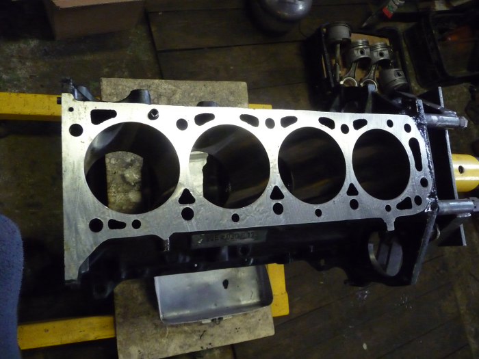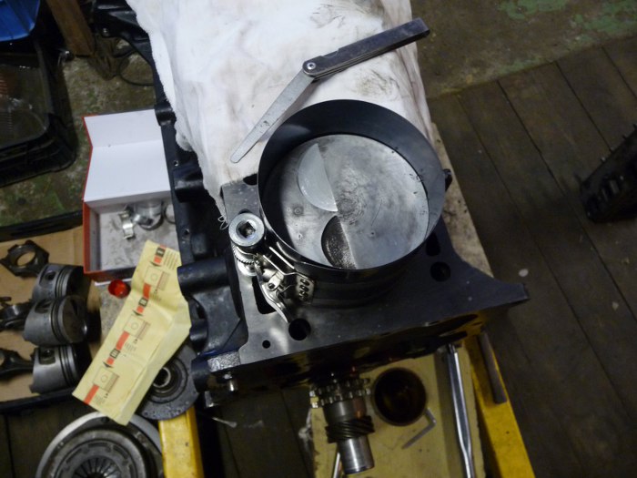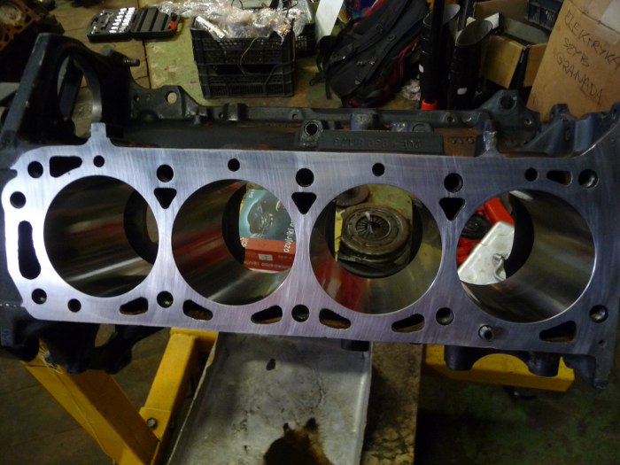 W międzyczasie blok był w szlifierni. Wstawione zostały tuleje pod stare tłoki. Tłoki były nieco już używane, więc tuleje są o kilka setnych części milimetra mniejsze od oryginału. Wymusi to dopasowanie pierścieni tłokowych, bo mogą mieć za małe przerwy. Każda tuleja ma inny wymiar pod konkretny tłok. Następnie zostały wybrane cztery najlepsze korby, zostało to wszystko wyważone. W tłokach zostały wyfrezowane większe podcięcia na zawory ssące, następnie również zostały wyważone. Wał został wyważony najpierw sam, potem z kołem pasowym, kołem zamachowym i dociskiem sprzęgła. Płaszczyzna bloku pod głowicą została splanowana. Głowica niestety okazała się pęknięta przy dwóch zaworach wydechowych (nie widzieliśmy tego wcześniej, bo była usyfiona nagarem). Drugą głowicę już Rafał kupił i dostarczyliśmy ją do szlifierni.