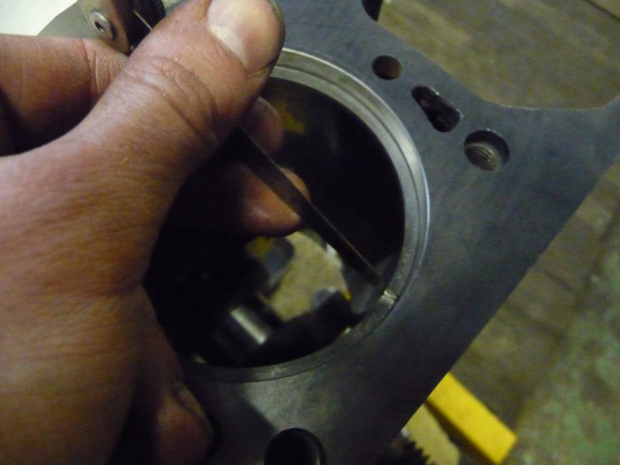 Następnie wziąłem pierwszy tłok, umyłem i założyłem na niego stary pierścień. Dzięki temu wkładając go do góry nogami w cylinder jestem w stanie go ustawić prostopadle do osi cylindra i ustawić pierścień wkładany luzem do cylindra w odpowiedniej pozycji. Wtedy zmierzyłem każdy pierścień szczelinomierzem, czy ma odpowiednią szczelinę. CO ciekawe większość miała szczeliny równe przewidzianemu minimum, więc nic nie musiałem poprawiać. Tylko pierwszy pierścień uszczelniający miał za małą o 0.20mm szczelinę i wymagał szlifowania. Dość trudno i żmudnie się to robi, trzeba zachować odpowiedni kąt szlifowania i nie zostawić zadziorów na krawędziach. Po szlifowaniu sprawdziłem - szczelina mieści się w normie.