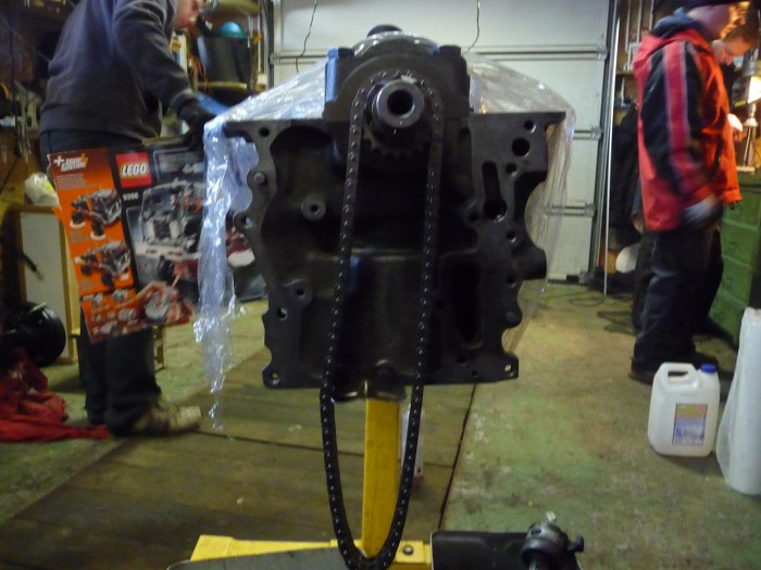 Następny w kolejce jest łańcuch rozrządu. Rafał mnie zapewniał, że niedawno był wymieniany, więc zostaje, wygląda ok. Potem blaszka pomagająca trzymać kółko wałka rozrządu (już przykręcona, widoczna u dołu silnika, blisko krawędzi przy głowicy), a następnie długi, prosty ślizg łańcucha (przykręcany w te dwa otwory po lewej od łańcucha).