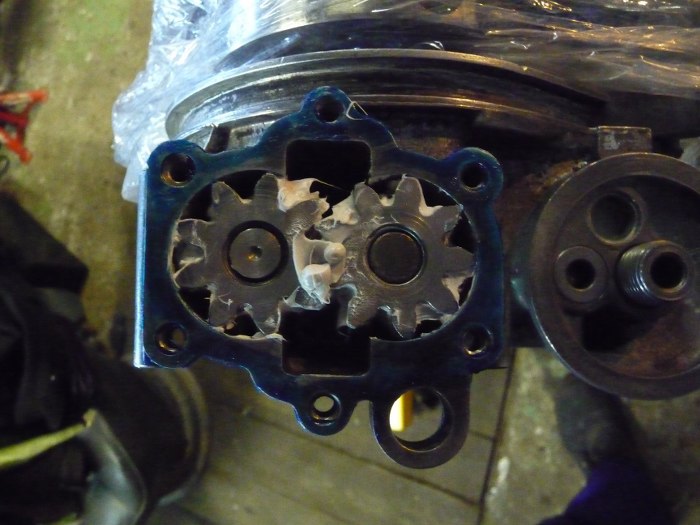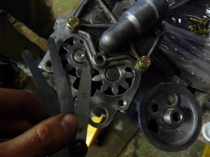 Następnie włożyłem koła zębate pompy oleju. Przykręciłem pokrywę pompy i sprawdziłem luz. Okazało się, że bez żadnej uszczelki już jest odpowiedni luz, więc uszczelki założyć nie mogę.