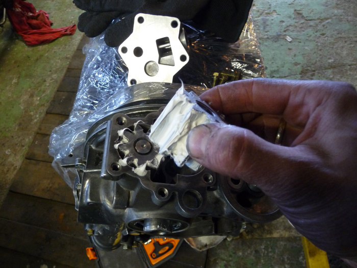 Nasmarowałem koła pompy smarem montażowym. Ułatwi to zassanie oleju podczas pierwszego kręcenia pompą.