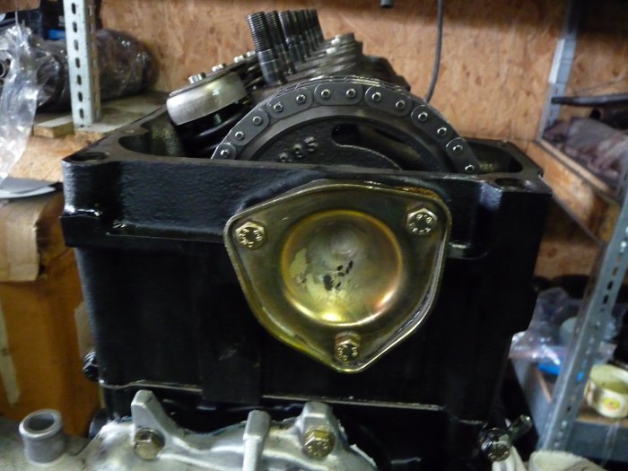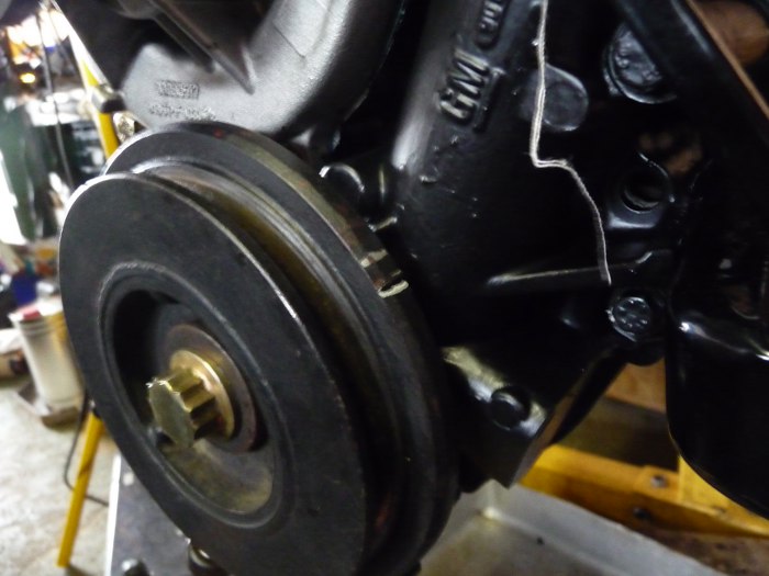Miskę zawiozłem do malowania proszkowego, a ponieważ parę innych rzeczy zostało do zrobienia, więc wziąłem się za nie. Pomalowałem pokrywę rozrządu, a po wyschnięciu jej przykręciłem pompę wody i koło pasowe wału korbowego.