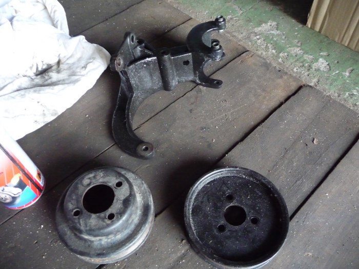 No dobra, biorę się zaz mycie. Niby nic przyjemnego, ale ja lubię oglądać efekty tej pracy. Weźmy na przykład na początek mocowanie alternatora i kółka pasowe.
