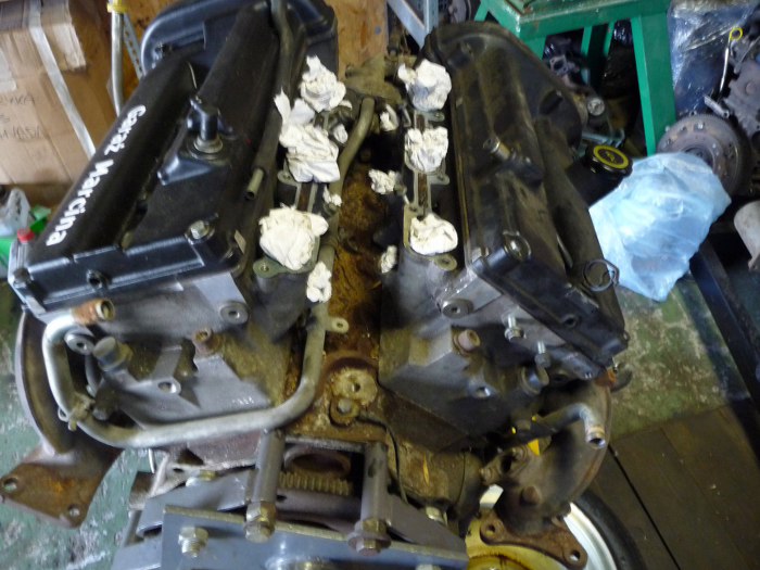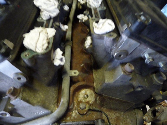 Po zdjęciu listew paliwowych okazało się, że między głowicami jest sporo syfu. W ogóle cosworthy to ciekawe silniki, powstały na bloku od 2.8; widać pomiędzy głowicami, że odlewy pod popychacze zaworowe zostały, po prostu nie są obrobione.