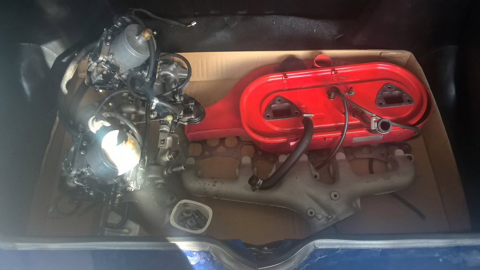W bagażniku był osprzęt odkręcony od silnika, ja dodałem jeszcze do tego rozrusznik i alternator, które zdjąłem przy wyjmowaniu silnika, a które nie będą mi potrzebne.