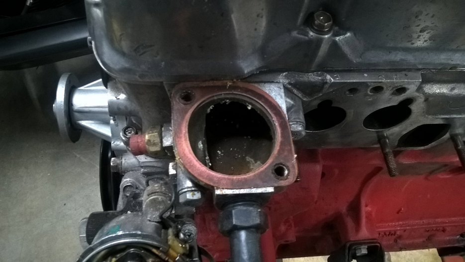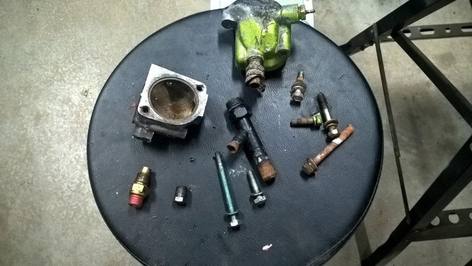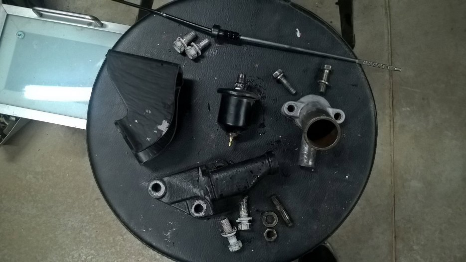 No to odkręcamy. Tu obudowa termostatu. Była przykręcona na nieoryginalną śrubę o twardości 5.8... niby da radę, ale ja i tak ją wymienię.
