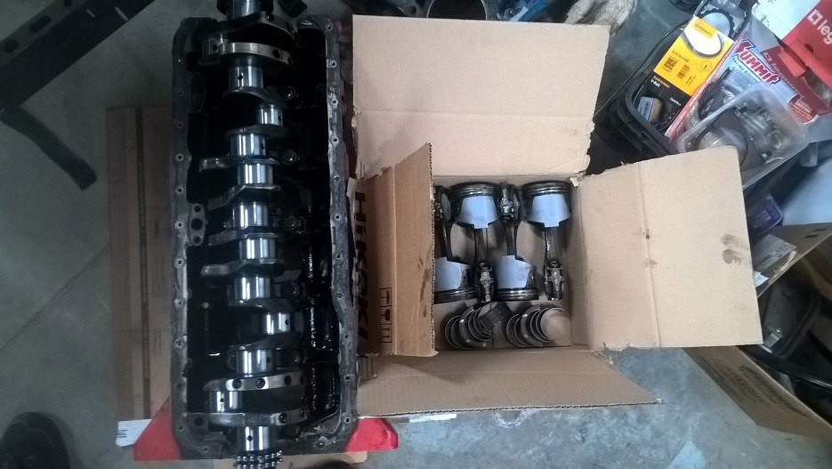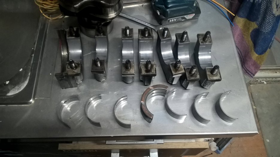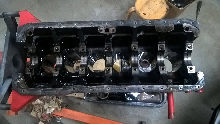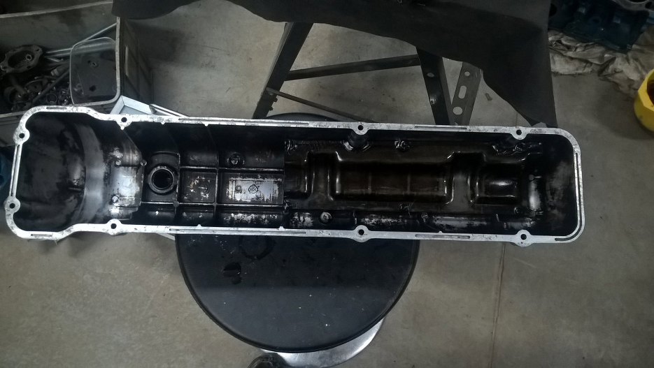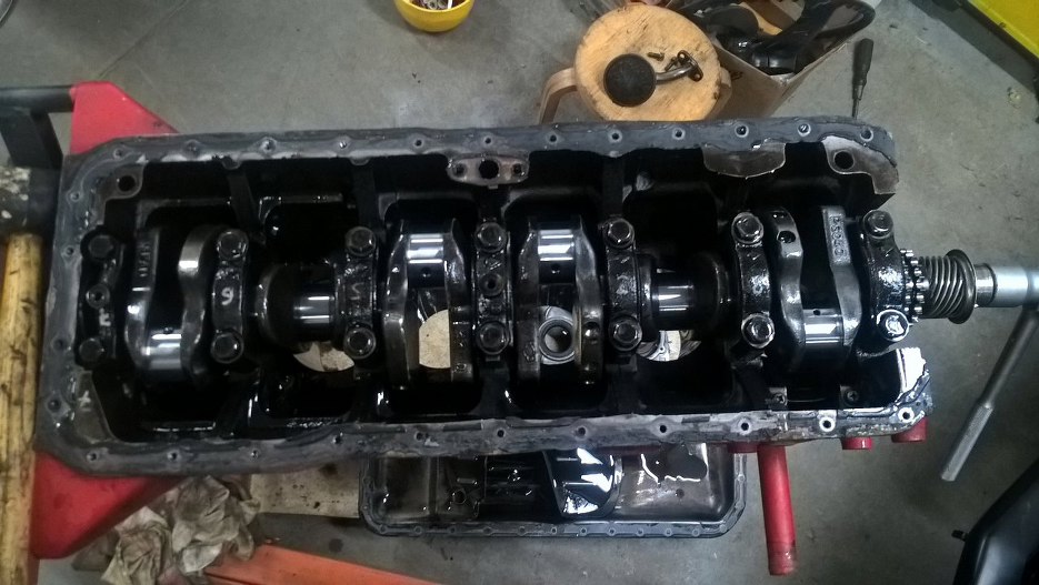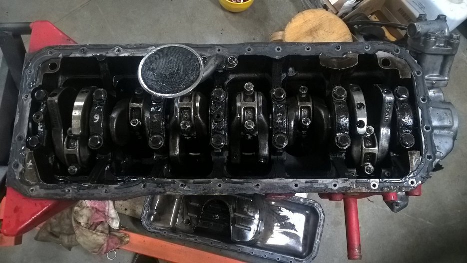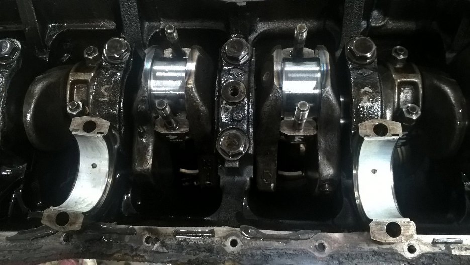 Za to dół silnika widać, że ruszany. Na podporach wału i korbowodach są napisane numerki, same korbowody dość czyste. Blok niestety już nie, cały w zapieczonym strym oleju.