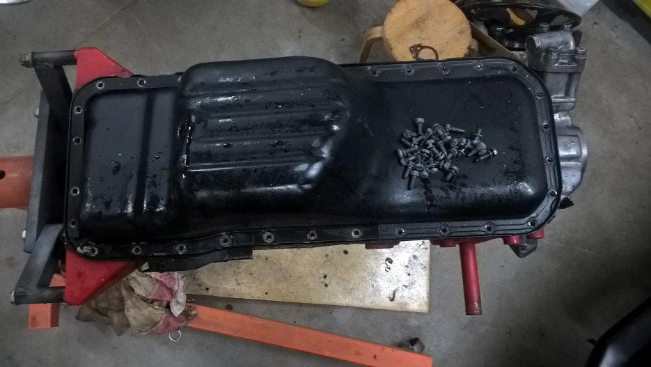 Odwróciłem silnik i dobrałem się do śrub mocujących miskę olejową.