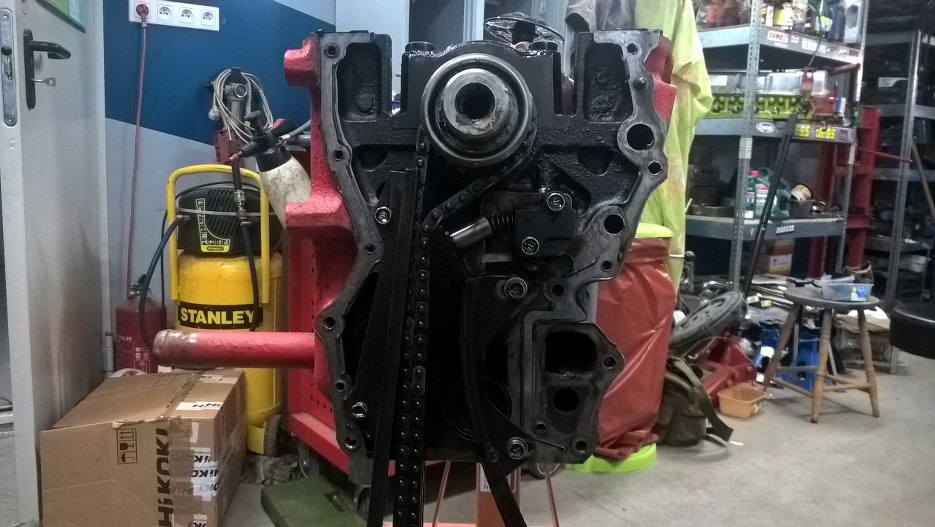Widać łańcuch rozrządu i jego ślizgi.