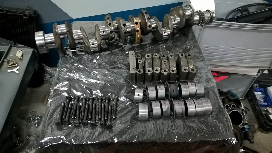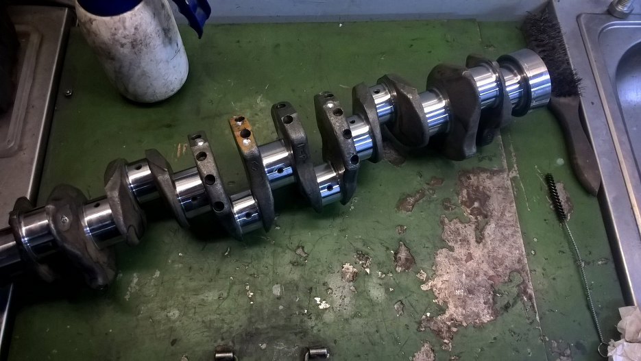 Wał został przeszlifowany na pierwszy nadwymiar. Ze szlifierni odbierałem go prosto z wyważania (widać ślady nowych nawierceń na przeciwwagach) jeszcze ciepłego po myciu. Domyłem go porządnie, łącznie z kanałami olejowymi.