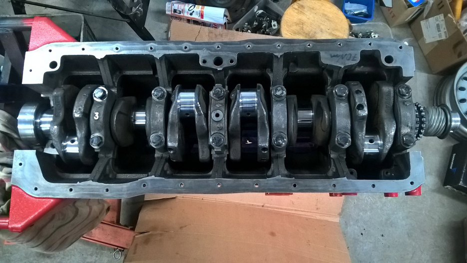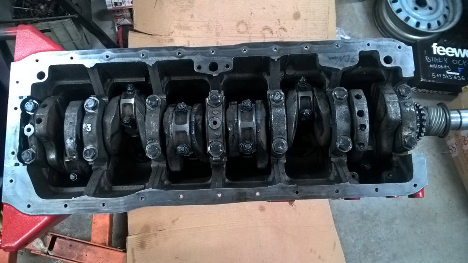 Włożyłem i panewki i wał. Stopy wału dokręcone z odpowiednim momentem. Brakuje ostatniej podpory, bo jeszcze nie założyłem simmeringu. Oczywiście nie mam tego na zdjęciu.