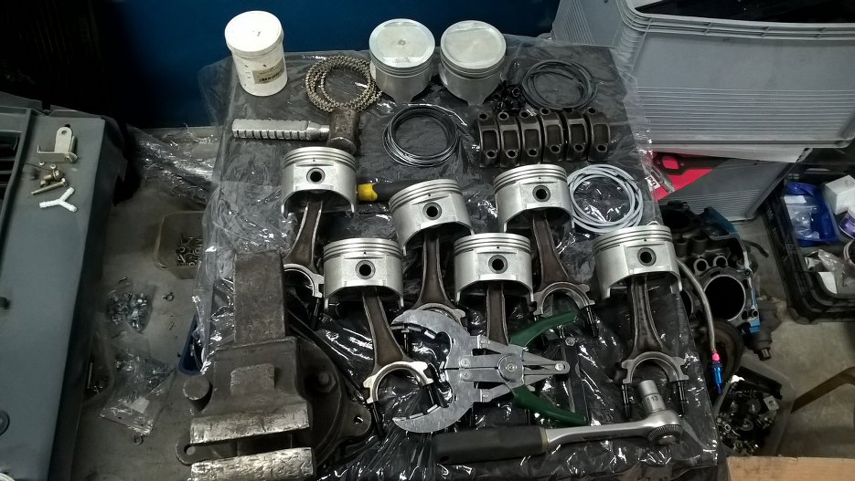 Mając już gotowe wszystkie części umyłem tłoki i korbowody i ułożyłem wszystko pod ręką.