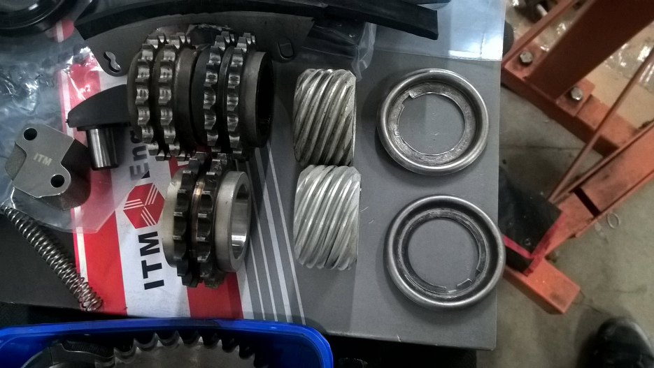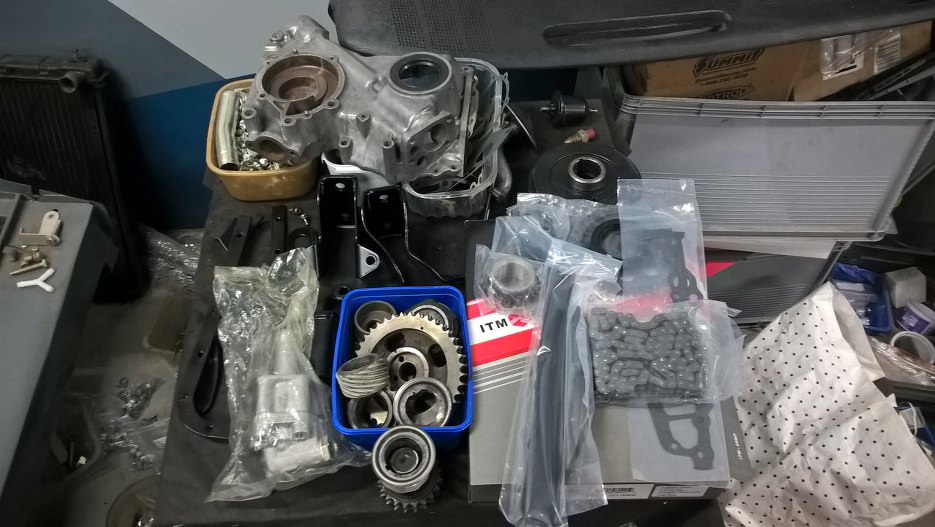 Do wyboru mam koła rozrządu używane i nowe (oczywiście będzie nowe), koło napędu aparatu zapłonowego i pompy oleju wybieram między dwoma używanymi. Nawet kółko blaszane służące do zatrzymania oleju na łańcuchu widać, że może być dobre i niedobre.