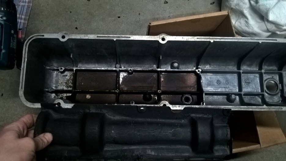 Miałem już zakładać pokrywę zaworów (pamiętasz, domywałem ją jakiś czas temu), ale zauważyłem, że twarda masa zakrywająca śrubki nieco popękała. Nie można tego tek było zostawić, więc odkułem ją całą, co wreszcie pozwoliło mi na dostanie się do śrubek i ich odkręcenie. Wcześniej ta masa była nie do ruszenia.