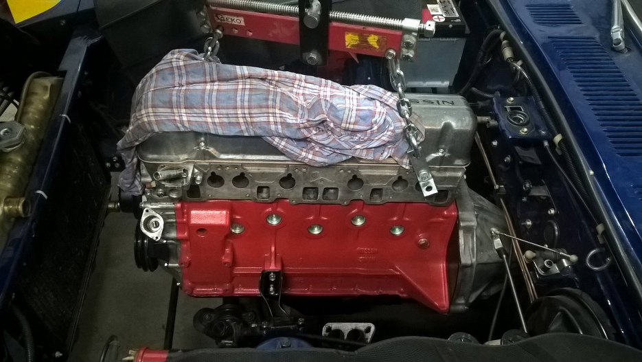 Nawet nieźle poszło, bo po pomachaniu silnikiem na lewo i prawo w końcu trafiłem skrzynią na wieloklin sprzęgła. Lekkim utrudnieniem było to, że silnik jest pochylony na stronę pasażera, więc trzeba go naciągnąć, żeby trafić śrubami łączącymi go ze skrzynią na gwint. Przykręciłem od razu poduszki do łap silnika.