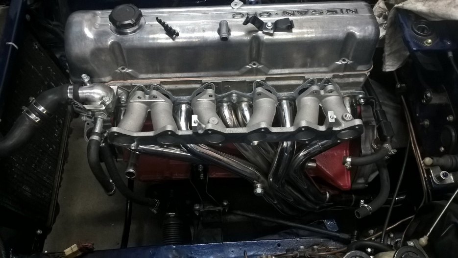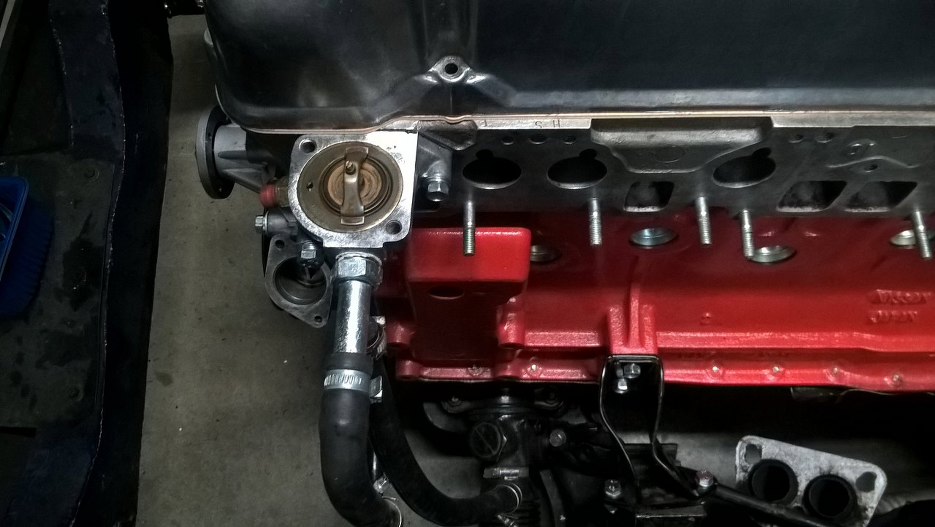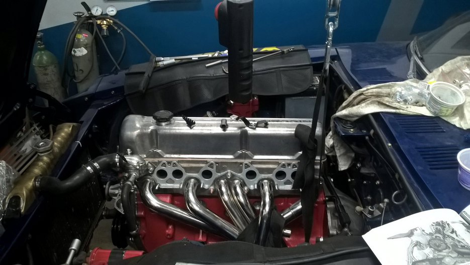 Przykręciłem pokrywkę termostatu i podłączyłem chłodnicę do silnika. Wyjąłem stary układ wydechowy (jest w jednym kawałku od głowicy aż do ostatniego tłumika) żeby przymierzyć nowy, rurowy kolektor wydechowy. Jest bardzo ładny.