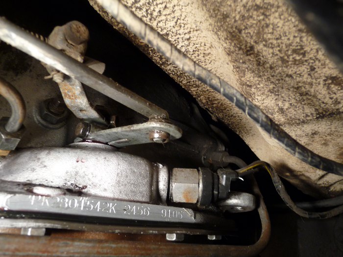 Nie cieknie przez dobę. Potem znowu kapie... Wymyłem całą skrzynię dookoła i co się okazało? Jak silnik pracuje, to poziom oleju w skrzyni jest niski - pompa oleju pompuje go w całą skrzynię i konwerter momentu. Gdy samochód stoi nieuruchamiany, to olej z konwertera powoli z niego spływa aż zaczyna wyciekać. Którędy? A właśnie tędy: