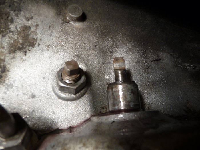 Fajnie wygląda pustawa skrzynia, co? Na zdjęciu powyżej widać otwór (ten duży u góry zdjęcia) po wybieraku, zwisa też pręt od blokady PARK skrzyni. Na zdjęciu poniżej widać wybierak po prawej stronie.