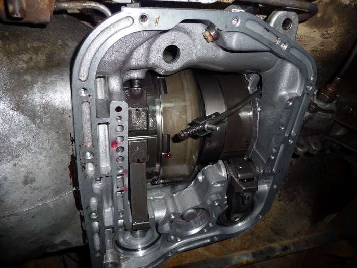 Żeby to wymienić trzeba wyjąć skrzynię, zdjąć miskę olejową i odkręcić płytę sterującą. Ale, że do odważnych świat należy, robimy to metodą "na proktologa", czyli przez rurę wydechową. Zdjąłem mechanizmy wybieraka i dźwigni od przepustnicy.