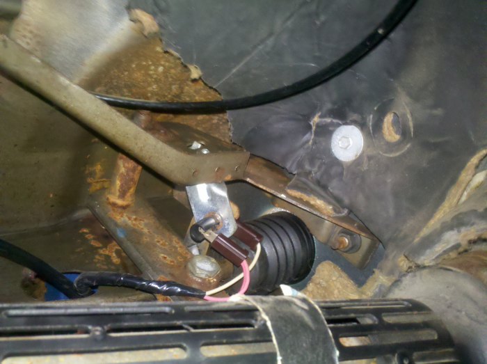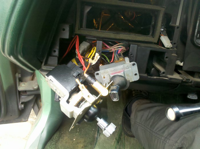 Poniżej widać, że coś działałem - narzędzi nie sprzątnąłem do zdjęcia. Miałem się zabrać za wymianę włącznika świateł (nie działała regulacja podświetlenia zegarów), ale najpierw musiałem ruszyć samochód z miejsca, stojący na hamulcu. Złapałem za dźwignię odpuszczenia hamulca... i została mi w ręku. Sprężyna, która ją trzymała do reszty mechanizmu już była słaba ze starości. Ciężko westchnąłem i dorobiłem nową :) Teraz hamulec można zaciągnąć i odpuścić.