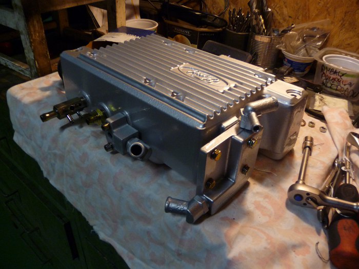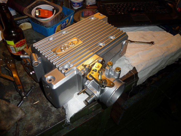 Airbox po renowacji. Brakuje jeszcze wtryskiwacza rozruchowego, ale on będzie przykręcony tuż przed pierwszym uruchomieniem silnika. Airbox i kolektor dolotowy fabrycznie były nie pomalowane, było to gołe aluminium,ale chcieliśmy zachować dobry wygląd tych części na dłużej. Pomalowanie lakierem bezbarwnym powoduje, że części te wyglądają na szare, więc stanęło na srebrnym kolorze.