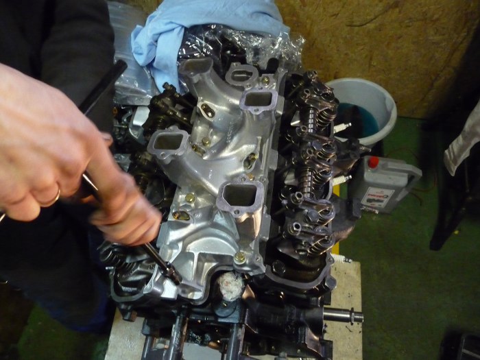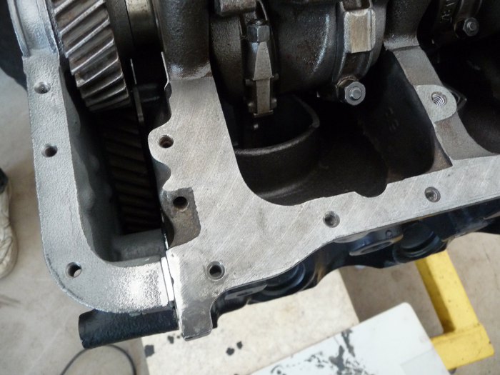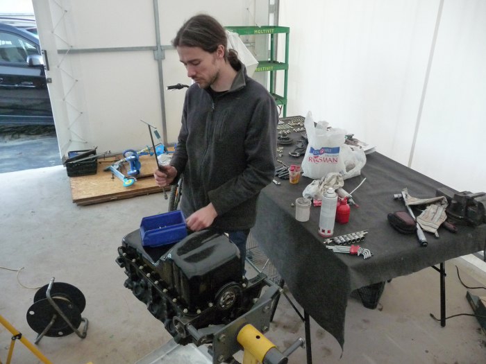 Tu nastąpiła przerwa. Okazało się, że wał korbowy dziwnie stuka przy kręceniu nim lewo-prawo. Musieliśmy zdjąć miskę olejową i pokrywę rozrządu. Okazało się, że ciężko obracający się (na skutek smaru montażowego) wałek rozrządu powoduje ujawnienie luzu międzyzębnego między kołami rozrządu. Dred przywiózł kolejne koła rozrządu i wybraliśmy komplet z minimalnym luzem i poskładaliśmy wszystko z powrotem.