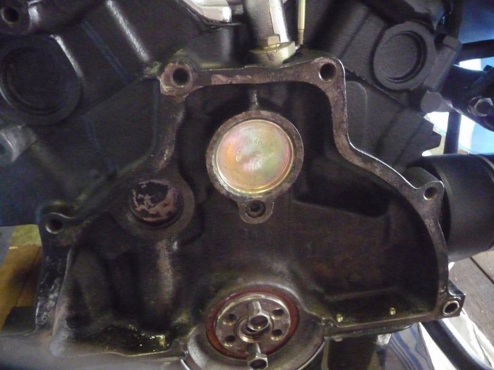Potem zdjęliśmy silnik ze stojaka. Wbiłem brakującą do tej pory zaślepkę wałka rozrządu na miejsce.