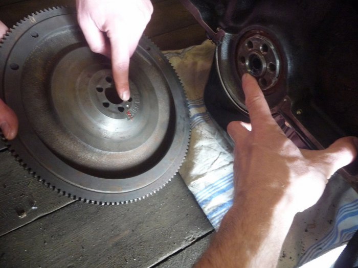 Koło zamachowe jest teoretycznie neutralnie wyważone, ale podczas wyważania całego układu korbowego znajdowało się w określonej pozycji w stosunku do wału korbowego. Zostało to zaznaczone, więc teraz skręcamy to razem dokładnie w tym samym położeniu.