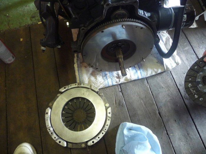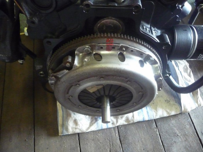Sprzęgło założone. Te wystające z niego coś to obcięty wałek sprzęgłowy ze starej skrzyni. Bardzo ułatwia centrowanie tarczy sprzęgła.