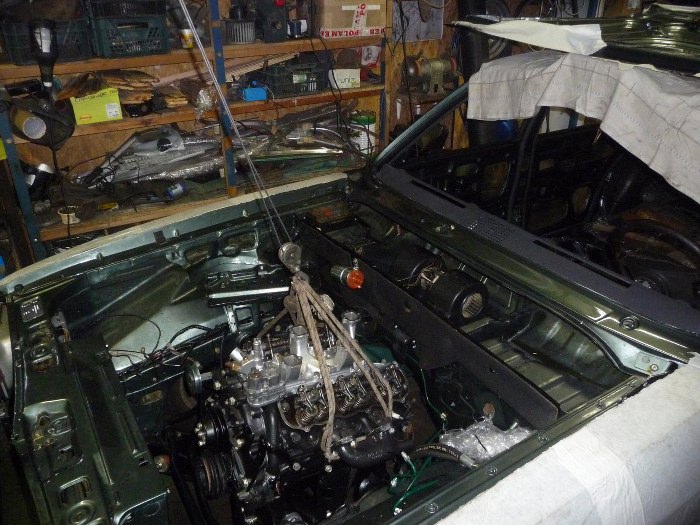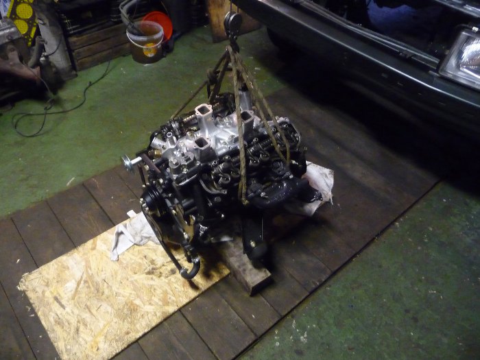 Silnik wrzuciliśmy bez problemu, bo nie było w samochodzie skrzyni biegów. Dlatego teraz samochód odsunęliśmy do tyłu, żeby wyciągarka naciągnęła silnik do mniej więcej poziomego położenia. Dzięki temu będzie nam łatwiej skrzynię założyć od dołu.