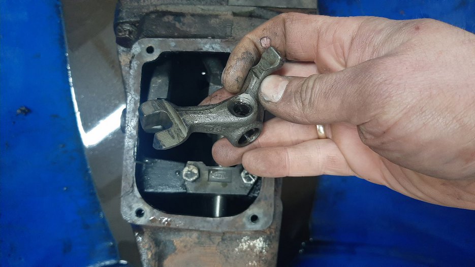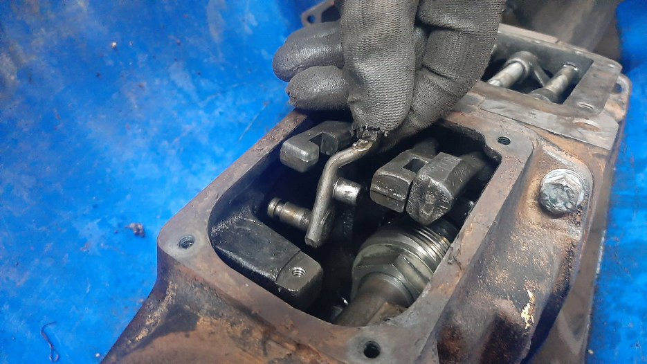 Po odkręceniu śruby blokującej widocznej na poprzednim zdjęciu zdjęty został element z pręta idącego do dźwigni zmiany biegów. On porusza poszczególne wybieraki.