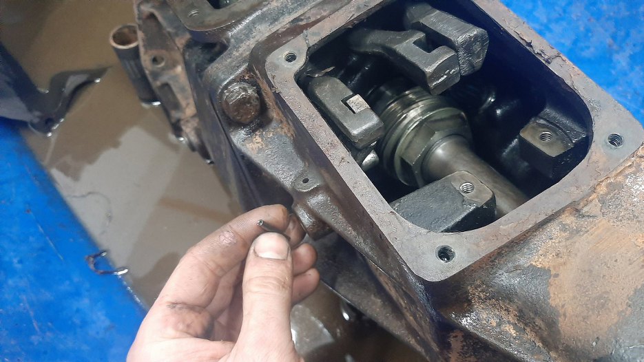 Teraz wybijamy pin trzymający wybierak wstecznego biegu.