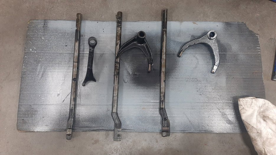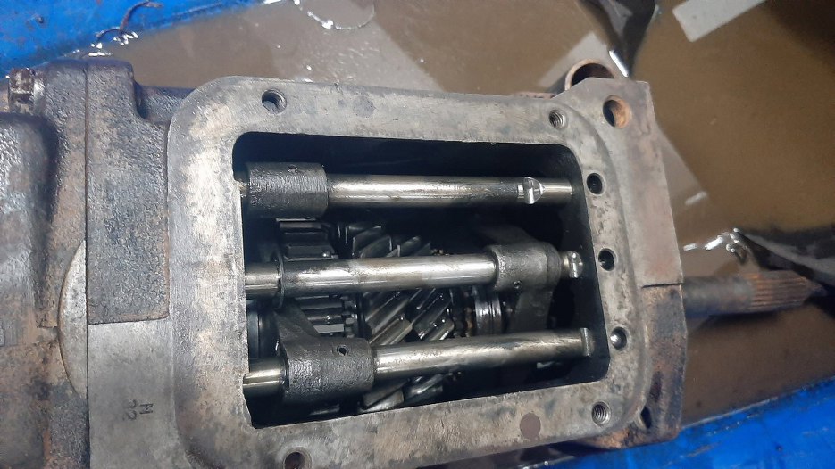 Po wybiciu pinów można wyjąć pręty w stronę tyłu skrzyni. Widełki wychodzą bez problemu do góry.