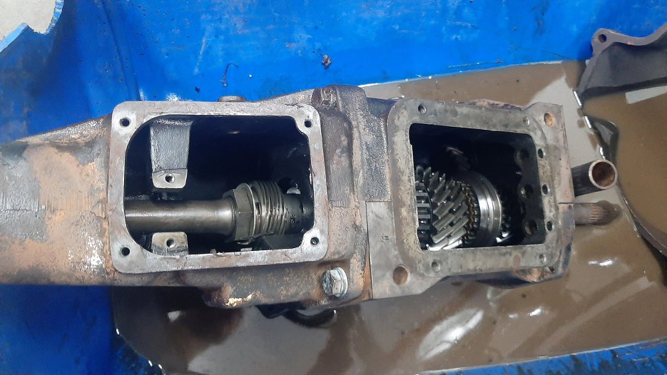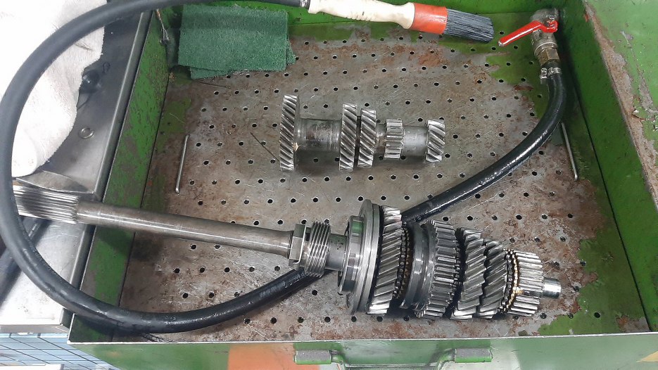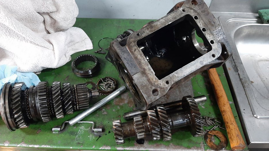 Miałem więcej nie rozkładać tej skrzyni, ale wysunął się nieco wałek wyjściowy, potem wejściowy, w rezultacie wypadł ze swojego miejsca synchronizator czwartego biegu. To już nie ma co kombinować, i tak rozłożenie reszty zajmie tylko chwilę. Wybiłem wałek, na którym obraca się tzw. "choinka" i opuściłem ją w dół skrzyni.