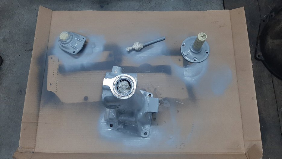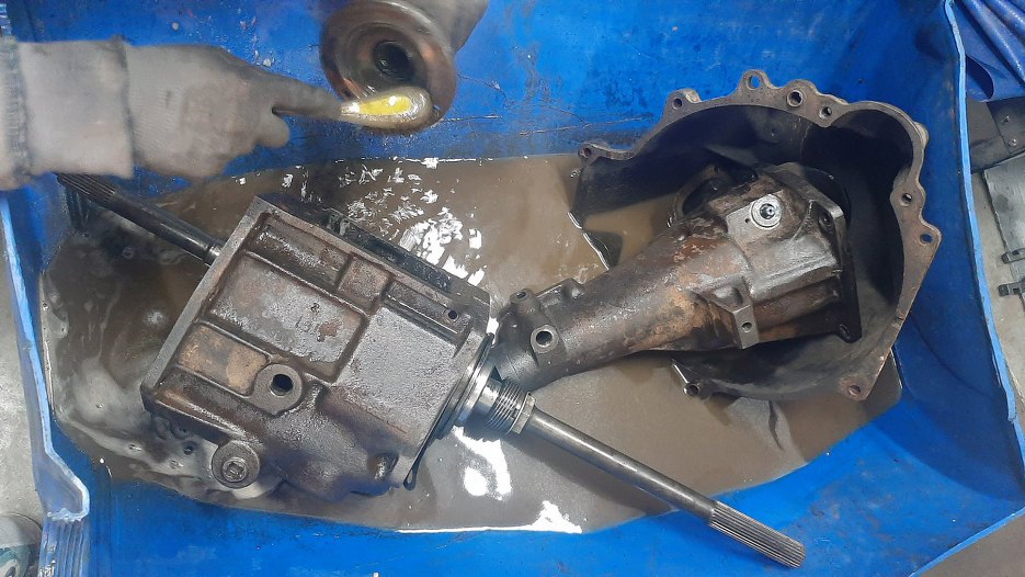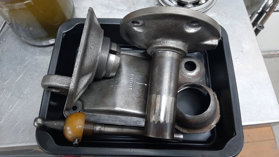 Po wstępnym przemyciu (mycie przeprowadzone w filii myjki warsztatowej, bo w myjce się nie mieści) można otworzyć dekielki. Standardowo wyskoczyły sprężynki i wpadły do skrzyni. Norma. Ta skrzynia jest o tyle inna od innych Fordowskich, że ma dwie pokrywki.