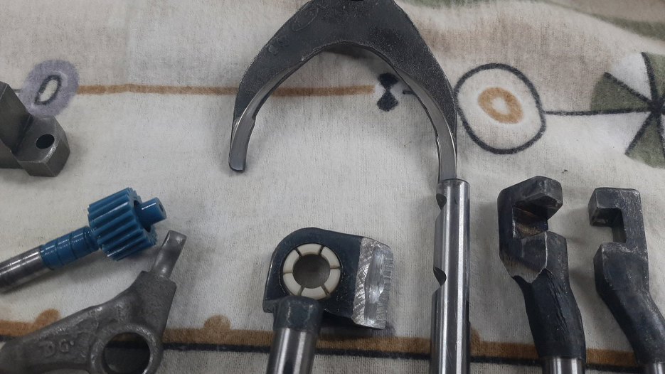 Te widełki są bardzo wytarte. I to jest akurat cała przyczyna wypadającego drugiego biegu - nie dopychają do końca właściwego kółka zębatego. Przy okazji warto też będzie wymienić synchronizator.