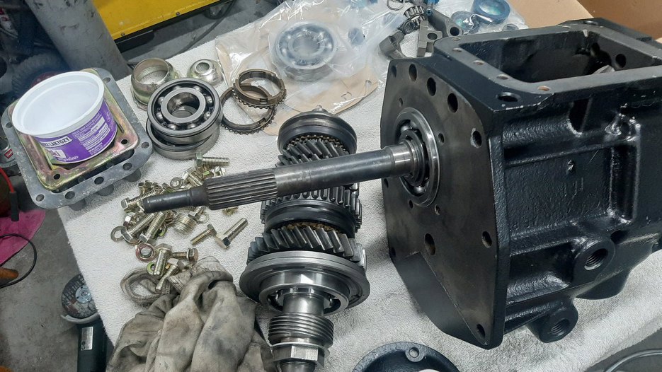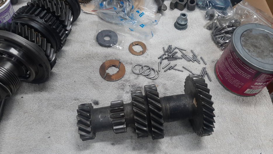 W tym momencie w innych skrzyniach lekko unoszę wałek pośredni i wkładam jego ośkę na miejsce. Ta skrzynia wszystko ma cholernie ciężkie, więc po prostu odwróciłem ją do góry korkami. Wałek opadł na swoje miejsce.