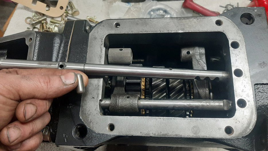 Włożyłem wybieraki do skrzyni i pierwszy pręt mechanizmu zmiany biegów. Ten akurat zmienia biegi 1 i 2. Między prętami włożone są takie bolce. Uniemożliwiają one wrzucenie dwóch biegów na raz.