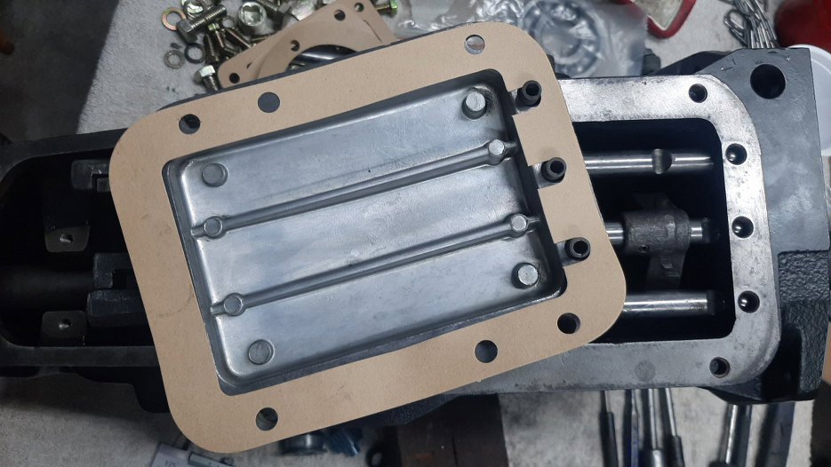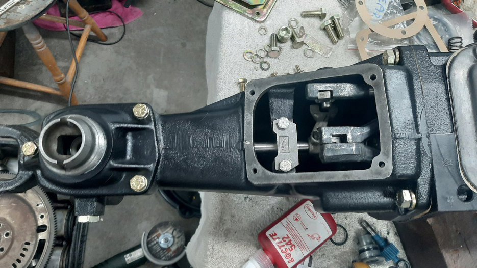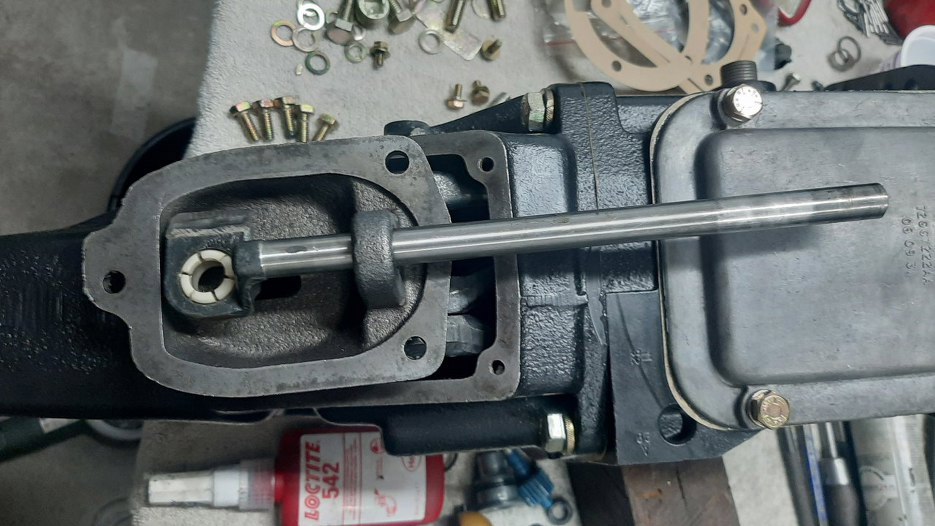 Pokrywka przykręcona, teraz pręt wybieraka idący od dźwigni zmiany biegów i jej pokrywki.