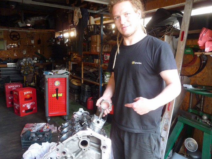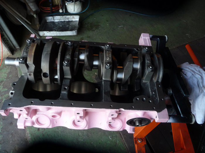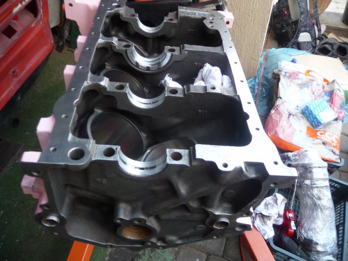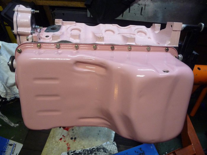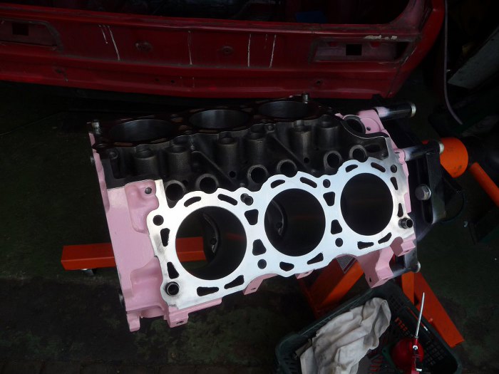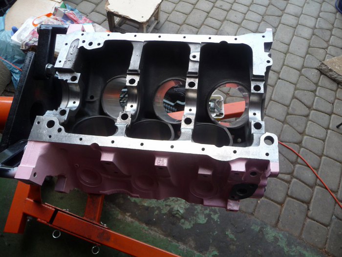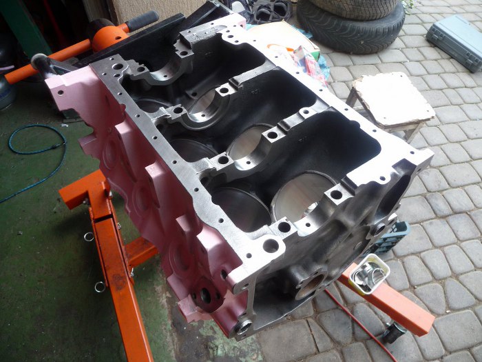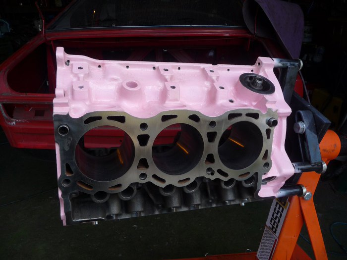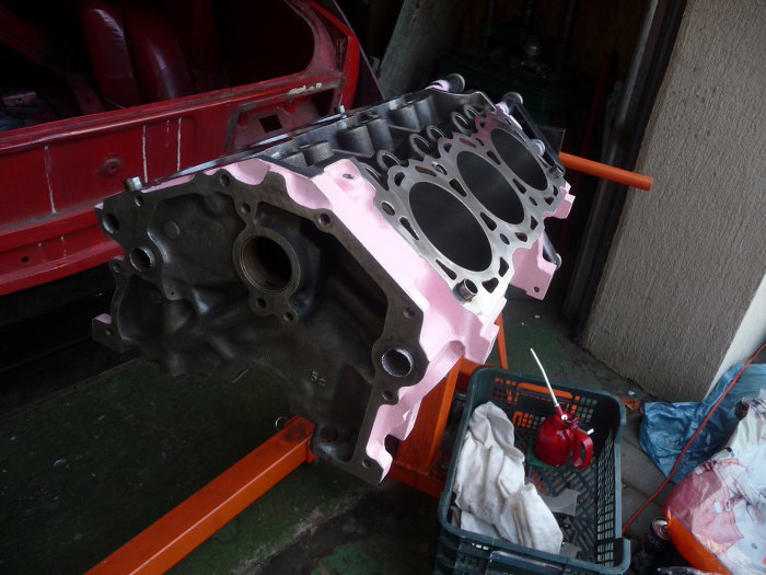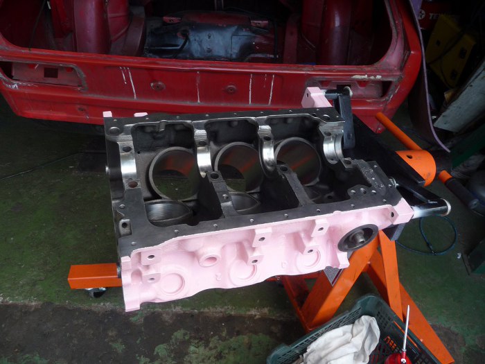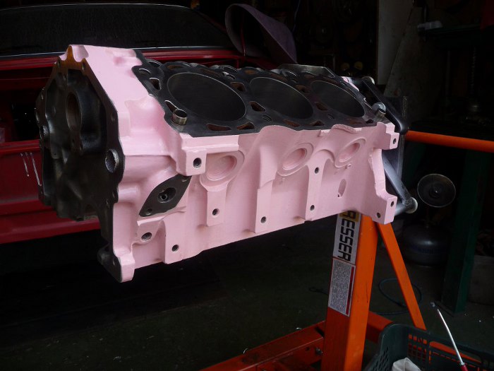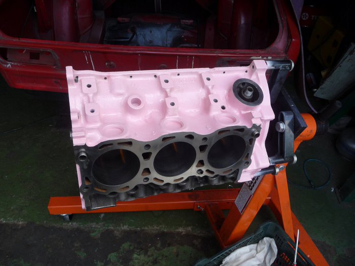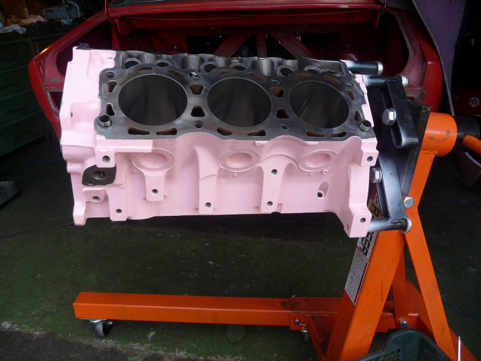 Silnik po obróbkach (niedużych - honowanie cylindrów wystarczyło żeby zniknęły wszelkie ślady rdzy i zużycia, oprócz tego splanowane zostały płaszczyzny pod głowice) został dokładnie umyty i pomalowany. Kolor jest pomysłem Dreda i wzbudził wiele kontrowersji w garażu :). Aczkolwiek teraz jakoś już wszyscy przywykli i tylko się razem z tego śmiejemy.