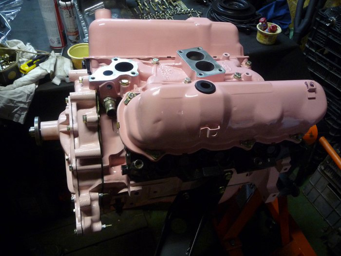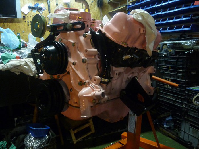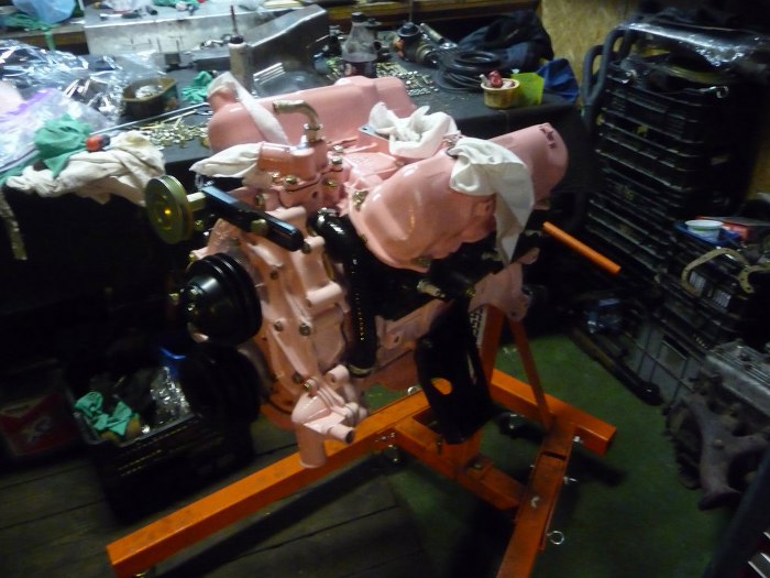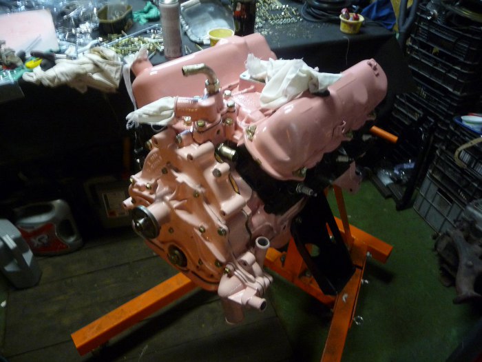 Przykręcone również zostały łapy silnika, filtr oleju i kolanko płynu chłodniczego na kolektorze dolotowym.