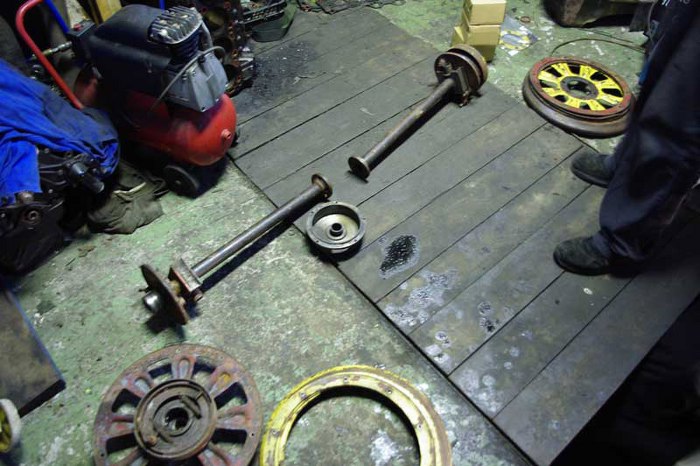 Zacznijmy od tylnej osi. Tu widać obudowy półosi, kawałek obudowy nawrotnika (elementu umożliwiającego zmianę kierunku jazdy - przód/tył) i kawałki kół. Brakuje osi, drugiej połowy i wnętrza nawrotnika. Trzeba to wszystko przygotować do odnowienia.
