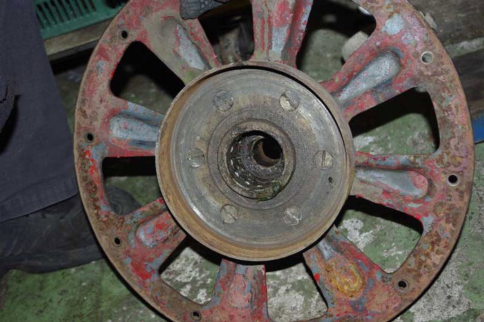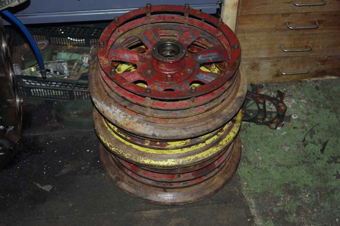 Z takich plasterków złożone są koła, trzyma się to na długich śrubkach i tulejkach dystansowych. Trzeba to złożyć, bo chcę koło sprawdzić na tokarce lub może na wyważarce u zaprzyjaźnionego wulkanizatora, czy jest proste. Najbardziej pogięte elementy są już wstępnie wyprostowane (młotkiem, a jakże).