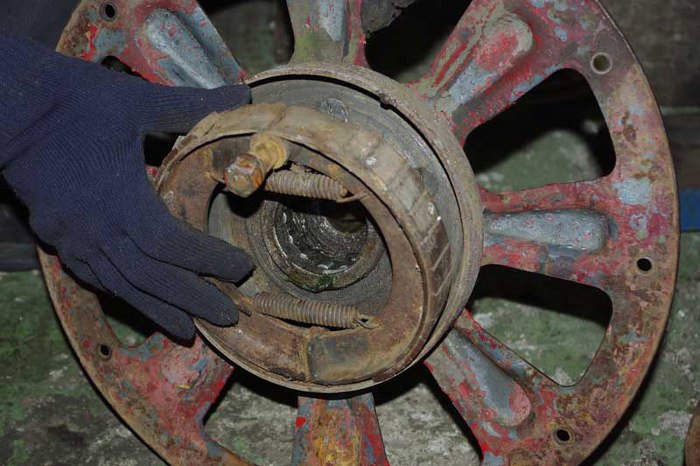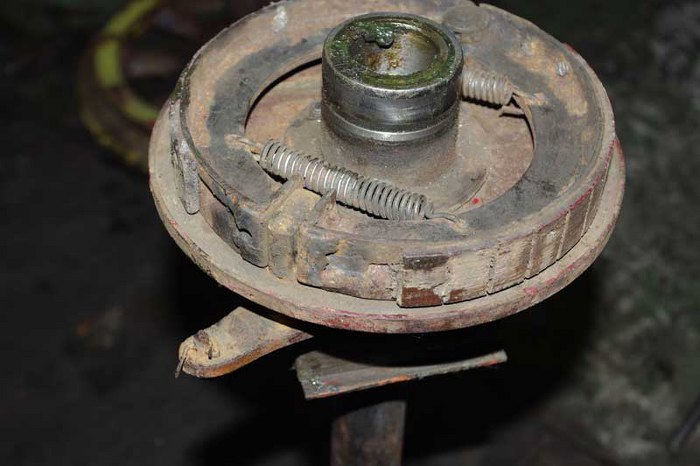 Szczęki. Bęben, co ciekawe jest przykręcany do koła jeszcze przed założeniem na oś, inaczej niż w samochodach. No ale tu nie zmieniamy kół, no bo i trudniej oponę przebić :)