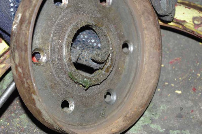 W bębnie hamulcowym widać filcowe uszczelnienie, żeby smar z łożysk nie wylatywał. Zobaczymy, czy to tak zostanie, czy przetoczymy te płaszczyzny tak, aby zastąpić filc simmeringiem.