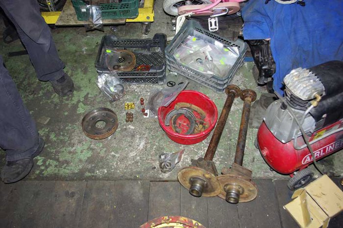 Ok, obudowy półosi wstępnie przygotowane do piaskowania, w misce rzeczy, które idą do cynkowania, a w skrzynce reszta. Mniej więcej :)
