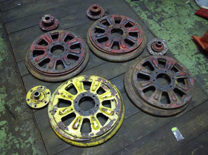 I rozebrane. Oznakowaliśmy części składowe, żeby potem każde koło złożyć w dokadnie taki sam sposób, w jaki było złożone. Krawędzie wewnętrzne kół są odlane i toczone. Są na tyle solidne, że nie wykrzywiły się podczas eksploatacji. Dwa zewnętrzne pierścienie z blachy były krzywe, ale dałem radę je wystarczająco wyprostować. Do zrobienia zostały "talerze" z kół. Musimy zeszliwować z nich rant (zawinął się na skutek toczenia po szynach), aby móc skutecznie sprawdzać, czy są proste. Potem sesja prostowania na tokarce u teścia. To właśnie ten element odpowiada za to, czy koło jest proste, czy bije na boki. Jak nam się nie uda tego wyprostować własnymi siłami to trzeba będzie to oddać do jakiegoś kowala.
